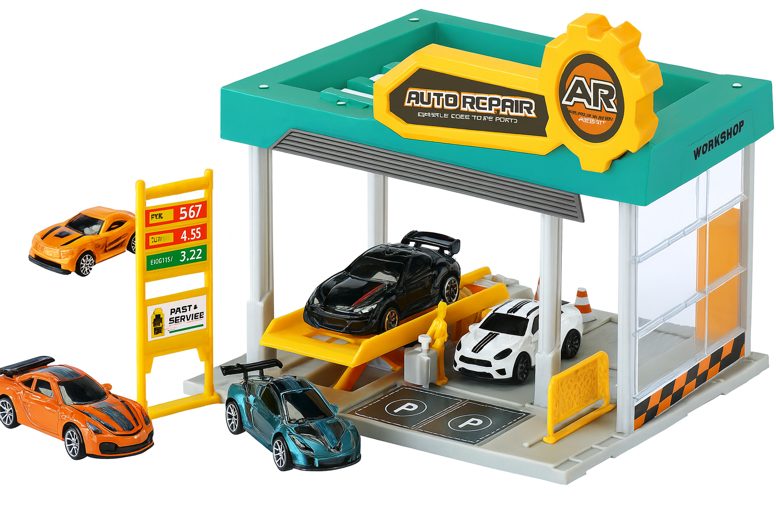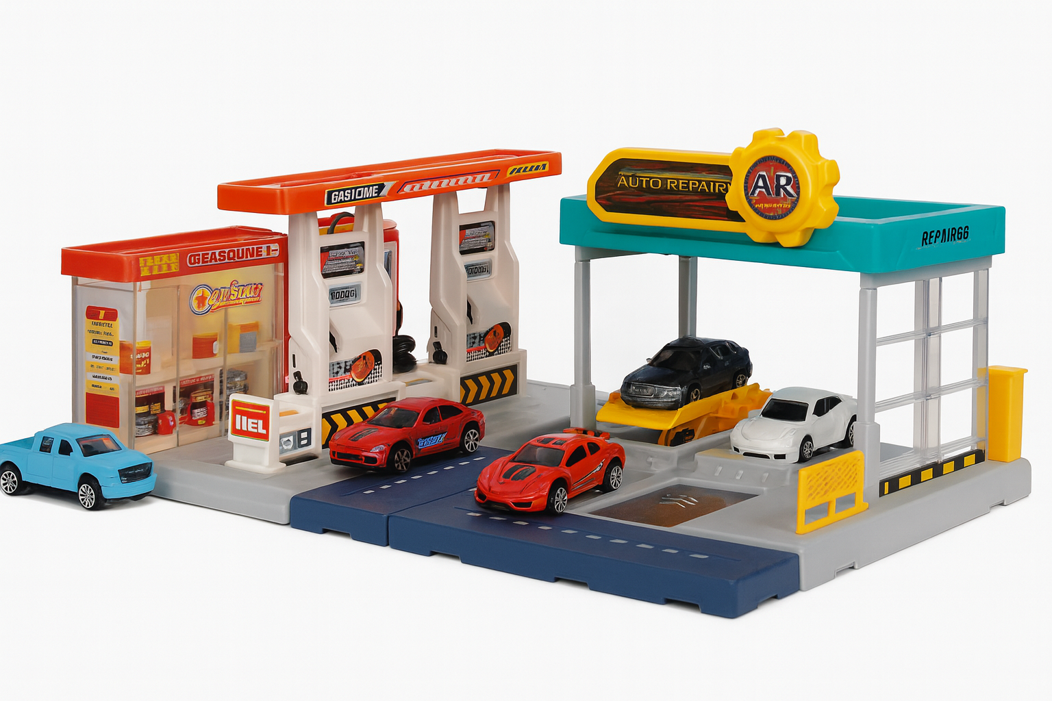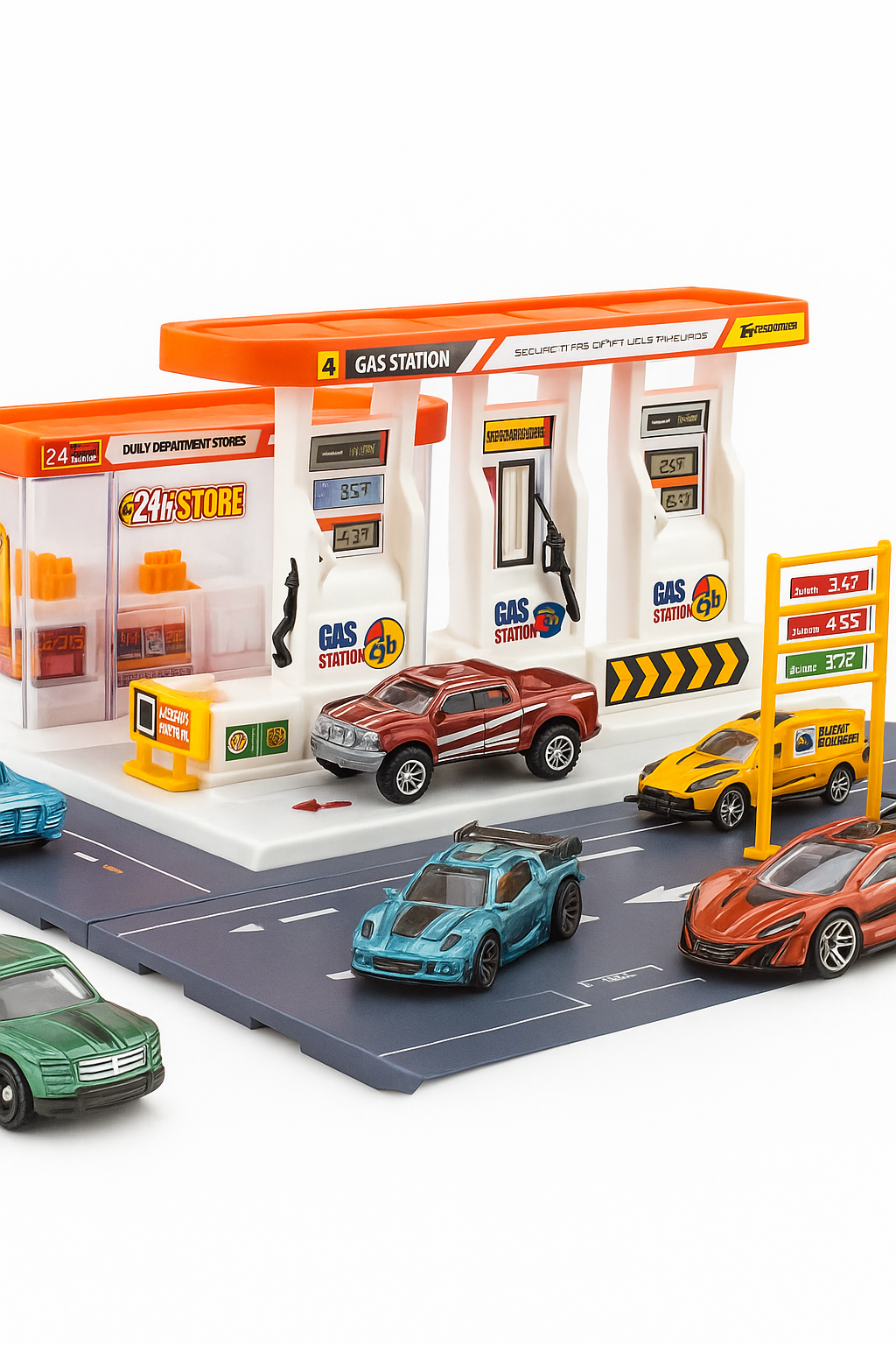 Benzin istasyonu ve araç servisi bölümü ile çocuklar için geniş bir oyun alanı sunarak, hayal güçlerinin gelişimini destekler.