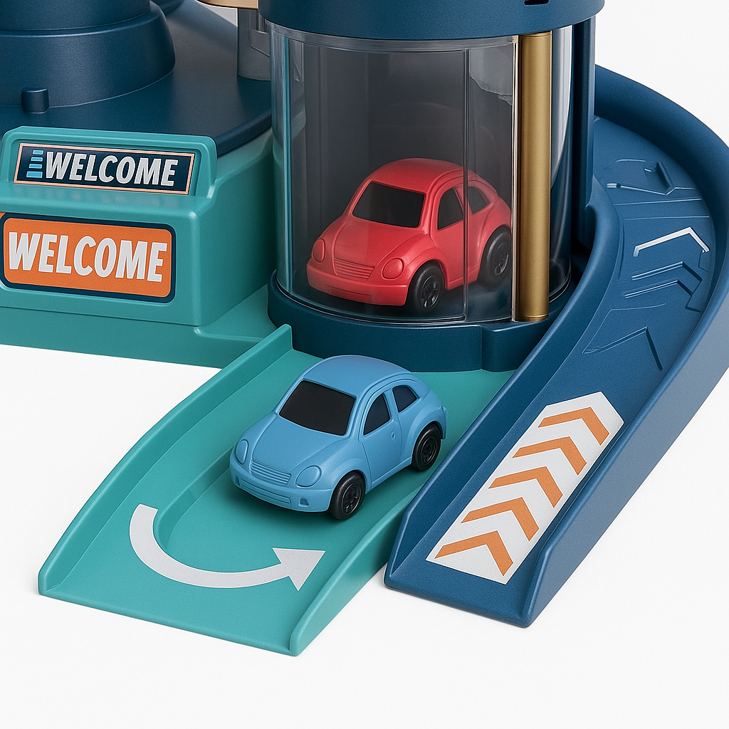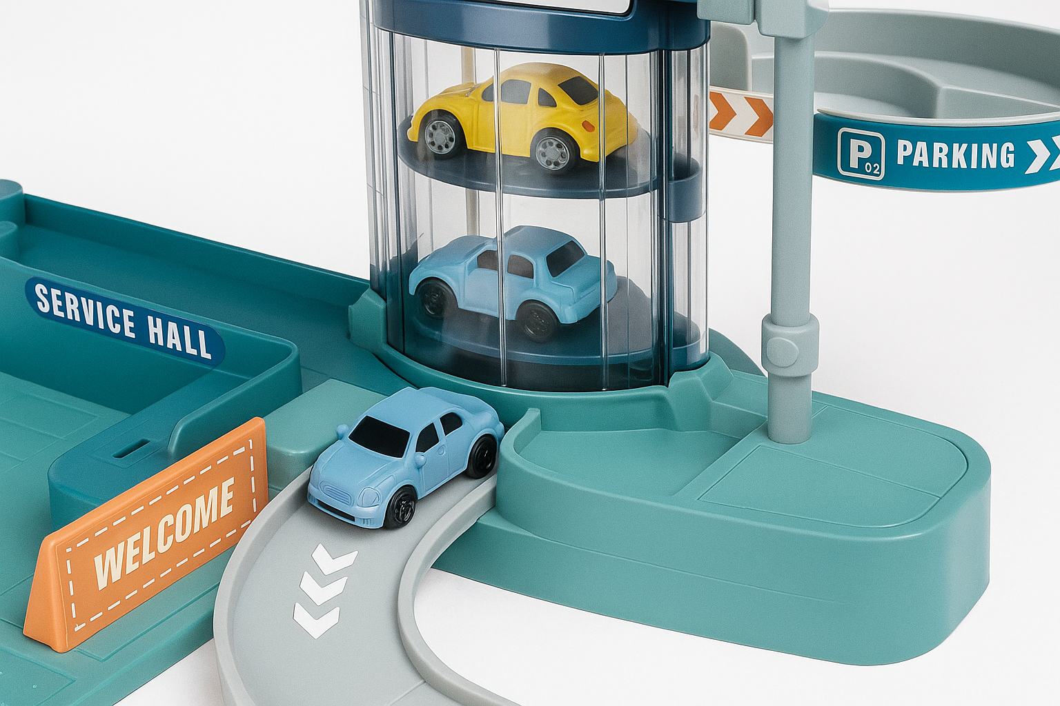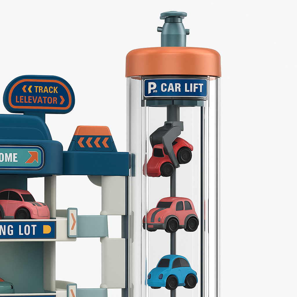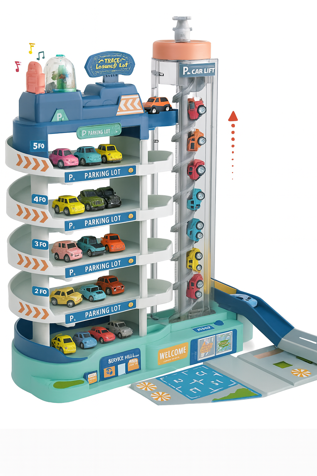 5 katlı otopark seti çocuklara eğlencenin kapılarını açıyor. Asansörü manuel olarak yada pil ile çalışmaktadır.