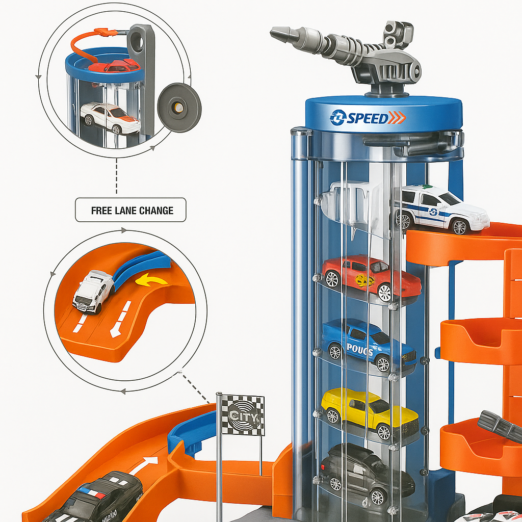Katlı otopark, spiral asansör ve mini araçlarla dolu bu set, çocukların hayal gücünü harekete geçiriyor.