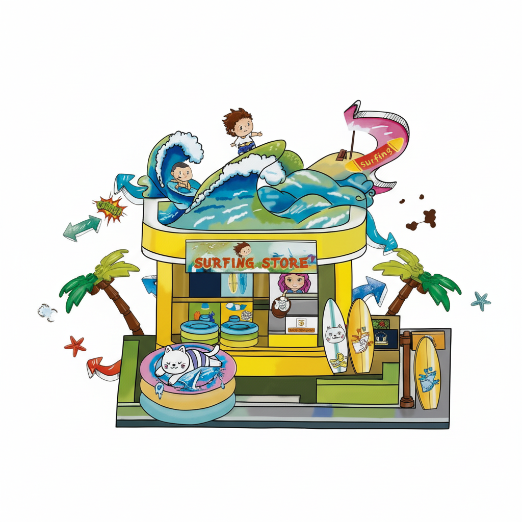 Yaratıcı Tasarım: Renkli sörf tahtaları, tropikal palmiye ağacı ve şık mağaza vitriniyle gerçekçi bir sahil atmosferi sunar.