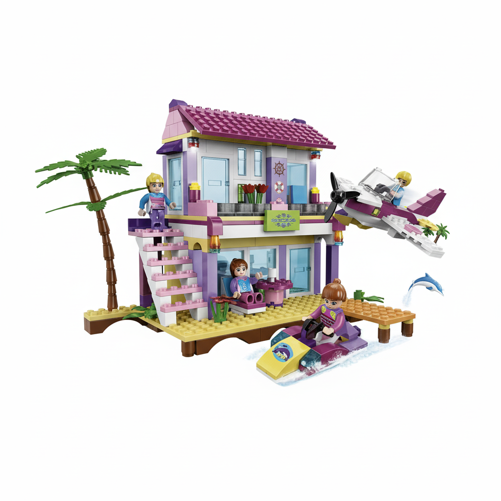 Bu kapsamlı setle çocuklar kendi iki katlı sahil villalarını inşa edebilirler. Balkonu, güneşlenme alanı ve iskelesiyle bu ev, tatil hikayeleri anlatmak için mükemmel bir dekor sunuyor. Üstelik set içerisinde yer alan deniz uçağı ve jet ski ile macera karadan denize ve havaya taşınıyor!
