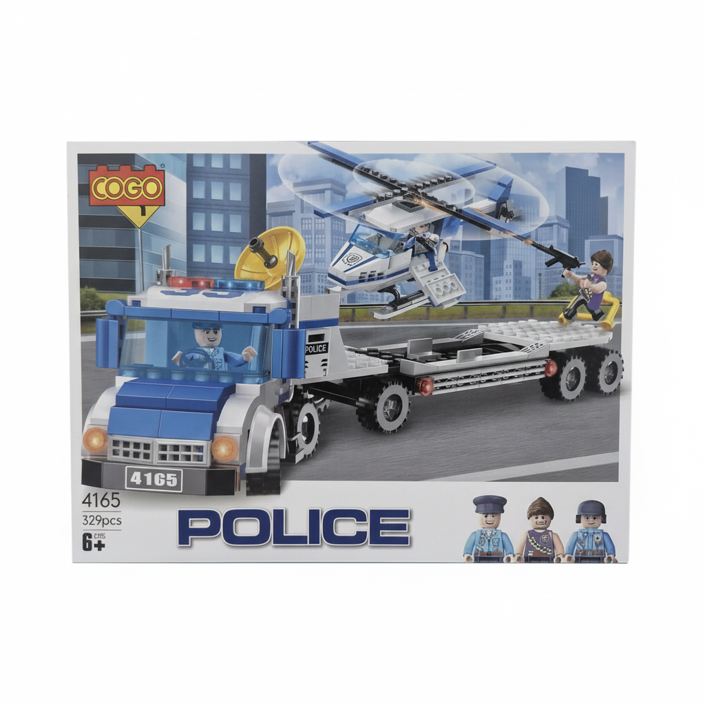 COGO’nun 329 parçalık Polis Helikopter Nakliye Aracı setiyle aksiyon dolu bir operasyon başlıyor! Set; güçlü bir polis kamyonu, çıkarılabilir nakliye römorku, detaylı bir polis helikopteri ve figürlerle birlikte gelir. Çocuklar suçluları kovalayabilir, havadan takip yapabilir ve heyecan verici polis senaryoları oluşturabilir.