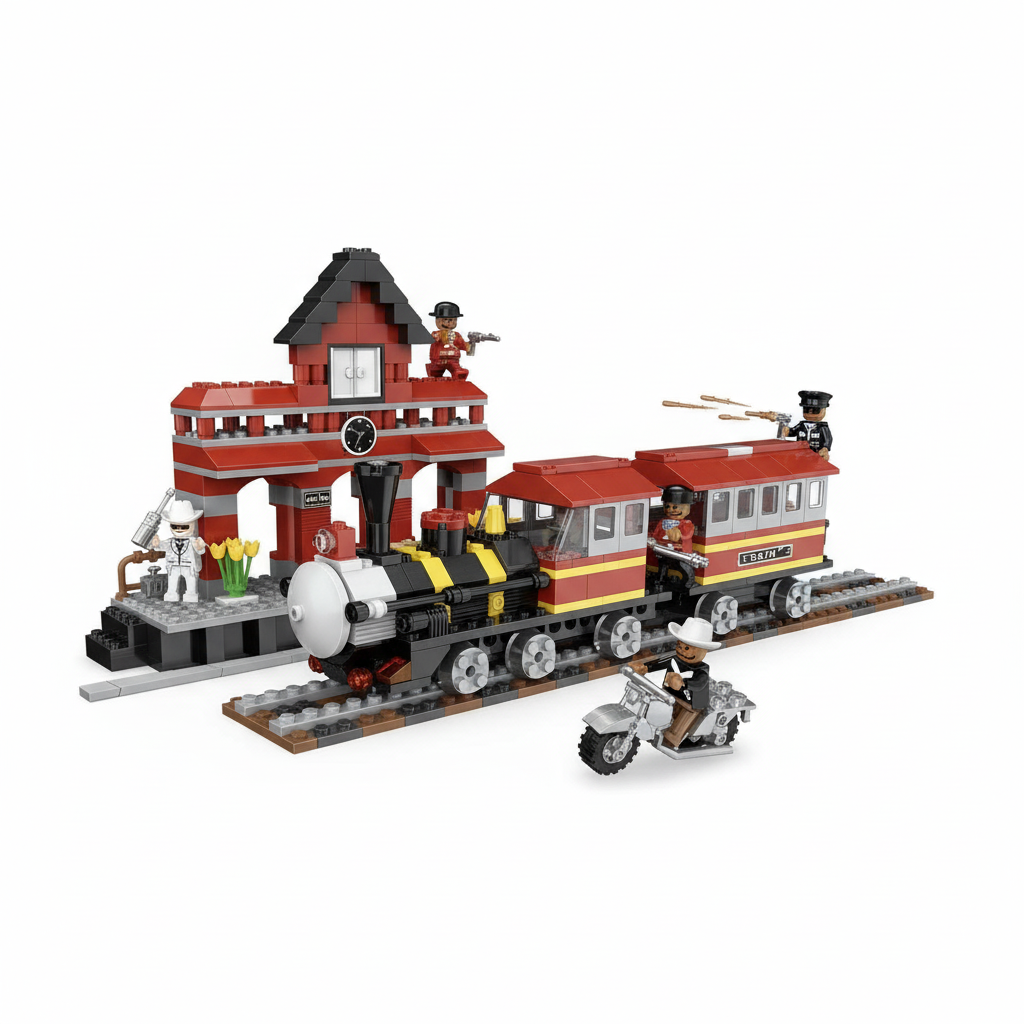 Klasik kırmızı tren istasyonu, buharlı lokomotif, vagon, raylar ve mini figürlerle dolu bu set, çocukların hayal gücünü harekete geçiriyor.