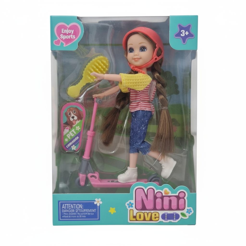 Nini Love Scooterlı Oyuncak Bebek Seti, sporu ve eğlenceyi seven çocuklar için harika bir oyun arkadaşı! Sevimli bebeğiyle birlikte gelen scooter, kask ve aksesuarlar sayesinde çocuklar eğlenceli hikayeler kurgulayabilir. El-göz koordinasyonunu ve hayal gücünü geliştirir.